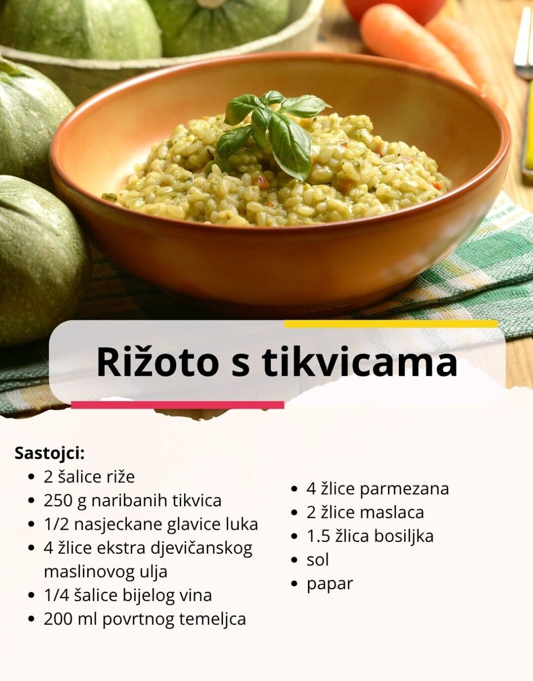 Rižoto s tikvicama je lagan i ukusan obrok koji je savršen za sve ljubitelje povrća. Kombinacija riže, tikvica, parmezana i maslaca stvara bogat i kremast obrok koji možete pripremiti za samo nekoliko minuta.