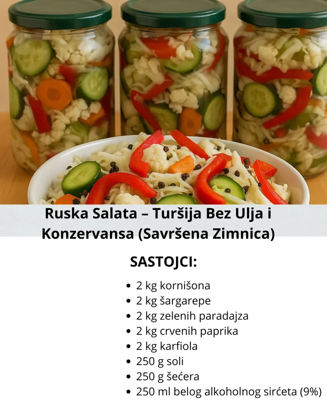 Ruska salata– turšija je kraljica zimnice i nezaobilazna na svakoj trpezi kada krene hladnije vreme. Ova verzija je potpuno prirodna – bez ulja , konzervansa i vinobrana – a povrće ostaje hrskavo i puno ukusa tokom cele zime.