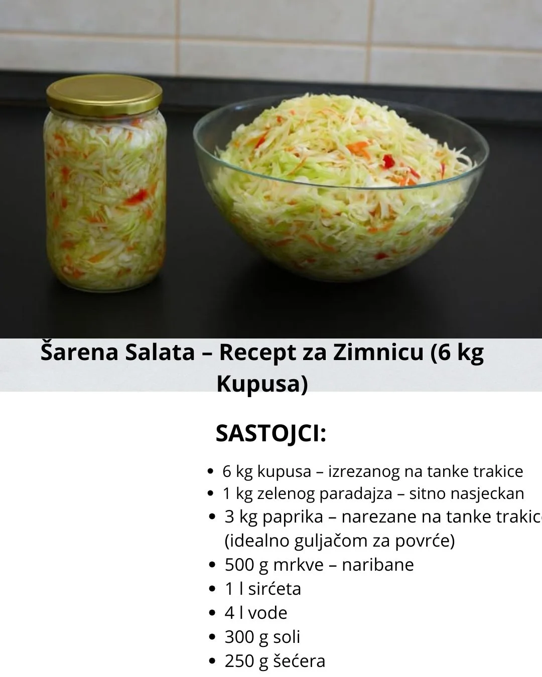 Tražite savršen recept za domaću zimnicu? Šarena salata od kupusa, paprika, mrkve i zelenog paradajza odličan je izbor. Lako se priprema, dugo traje i donosi svježinu i boju na vašu trpezu tokom cijele godine. U ovom receptu naučit ćete kako napraviti ukusnu i hrskavu šarenu salatu koja može stajati i do dvije godine.