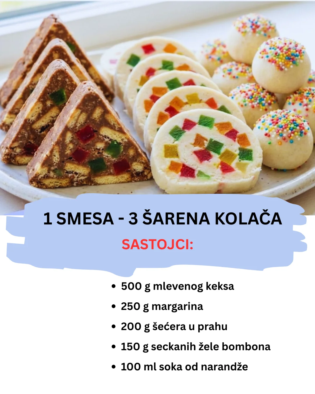 3. Vesele Kuglice: Od trećeg dela pravite loptice. Uvaljajte ih u šarene mrvice ili kristal šećer.
