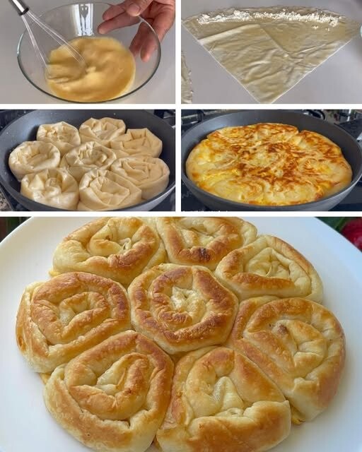 Razvucite jednu koru na radnoj površini i premažite tankim slojem maslaca ili ulja. Stavite manju količinu fila sa jedne strane kore, pa je pažljivo uvijte u rolatu. Zatim rolatu dajte oblik kovrčice (spirale) i stavite je na pleh obložen papirom za pečenje. Ponovite postupak sa svim korama i filom.