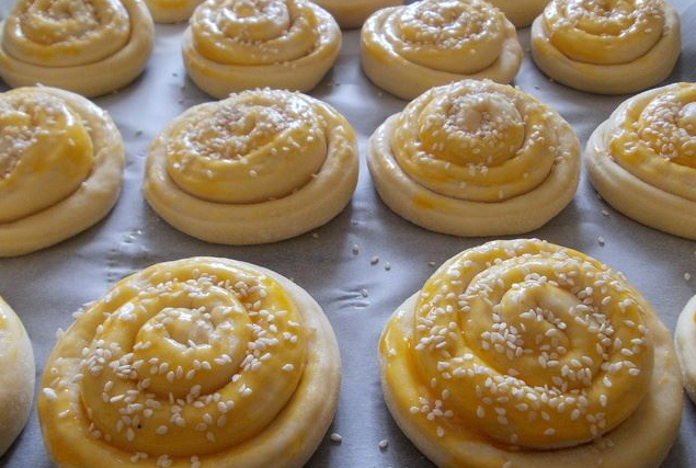 Premazati žumancetom izmućenim sa malo ulja i posuti susamom. Ostaviti da još malo narastu, dok se rerna zagrije