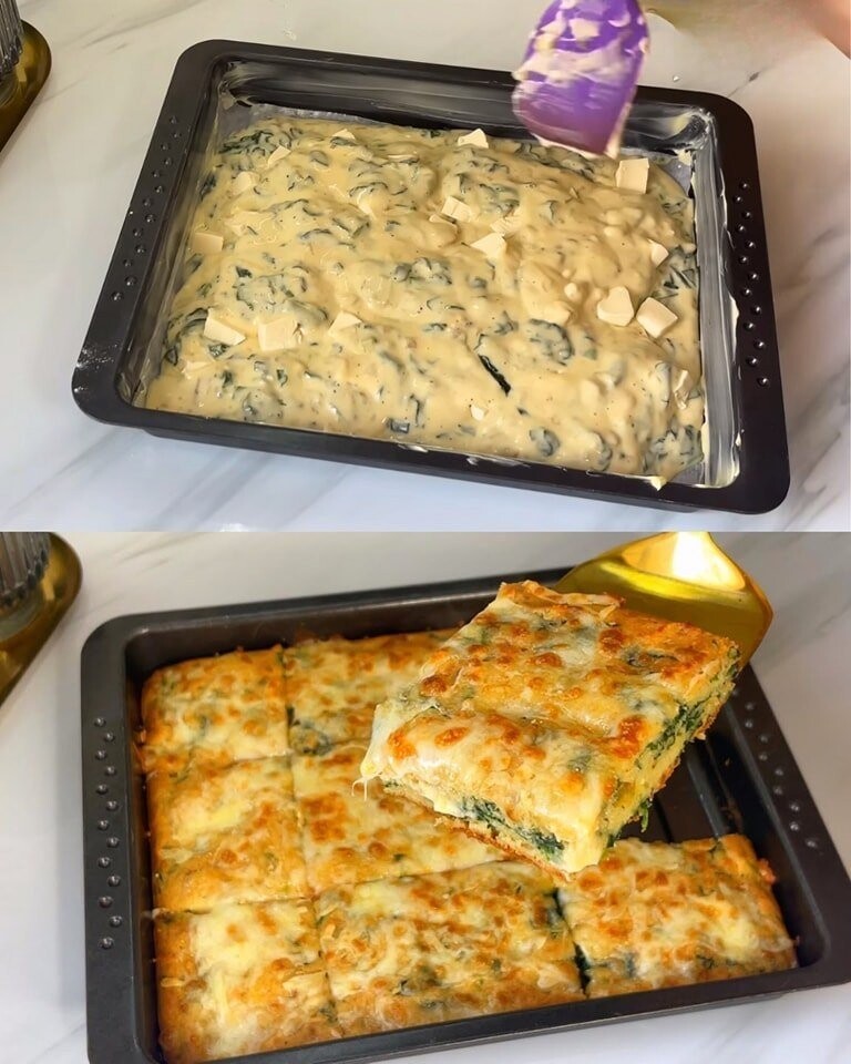 Pripremite se za pečenje: Smjesu izlijte u namašćenu posudu za pečenje i ravnomjerno rasporedite. Nadjenite ga trokutastim ploškama sira.