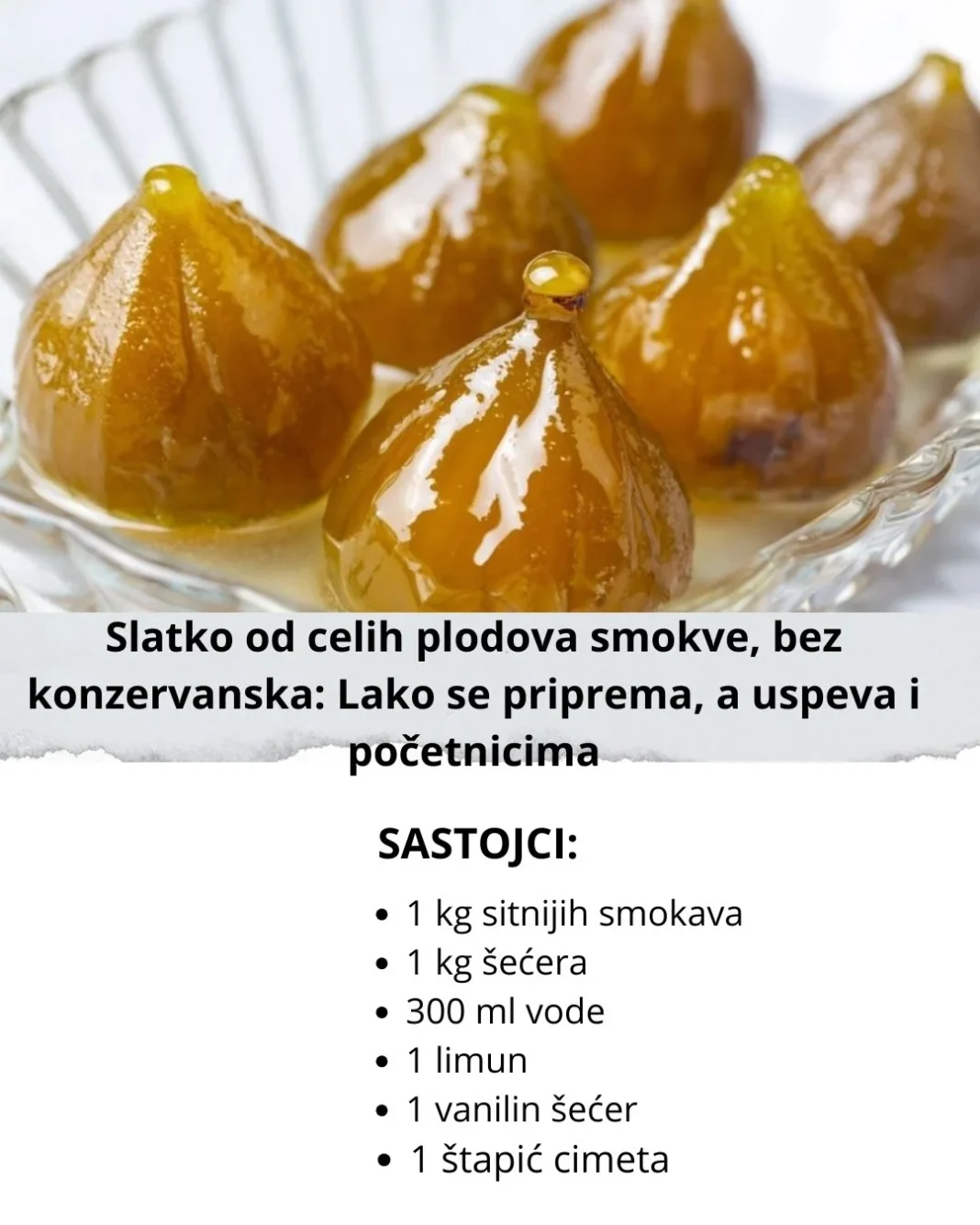 Slatko od smokve je jedan od dragulja domaće zimnice, poznato po svojoj raskošnoj aromi i punom ukusu. Svaka kašičica donosi miris leta i toplinu domaćinske kuhinje. Priprema se od celih plodova smokve, šećera i limuna, bez konzervansa, a može da traje mesecima u hermetički zatvorenim teglama. Savršeno je uz jutarnju kafu, palačinke, kolače ili jednostavno na kriški hleba sa puterom.