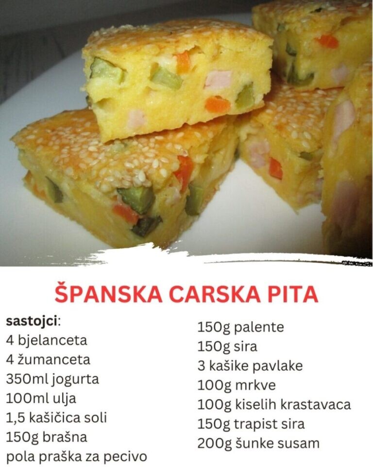 Ako volite slane pite koje su bogate, sočne i brzo se spremaju, ova španska carska pita će vas oduševiti. Može da posluži kao glavno jelo, užina ili specijalitet na svečanoj trpezi. Spoj jogurta, sira, palente, šunke i kiselih krastavaca daje joj pun ukus i neobičnu teksturu kojoj je teško odoleti.