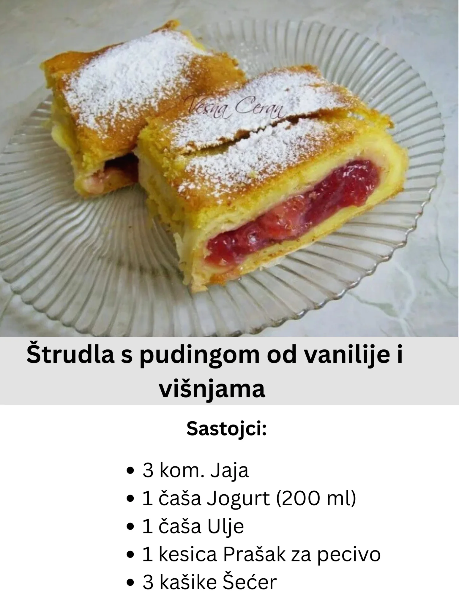 Još jedan plus ove štrudle s pudingom od vanilije je što je vrlo prilagodljiva sezonskom voću – mnogi dodaju višnje ili aromu mandarine kako bi recept dobio nošnju svježe note. Uživajte u štrudli s pudingom od vanilije i višnjama uz čaj ili kafu! Ne zaboravite zapisati recept i javiti nam u komentarima ispod kako vam se svidio.