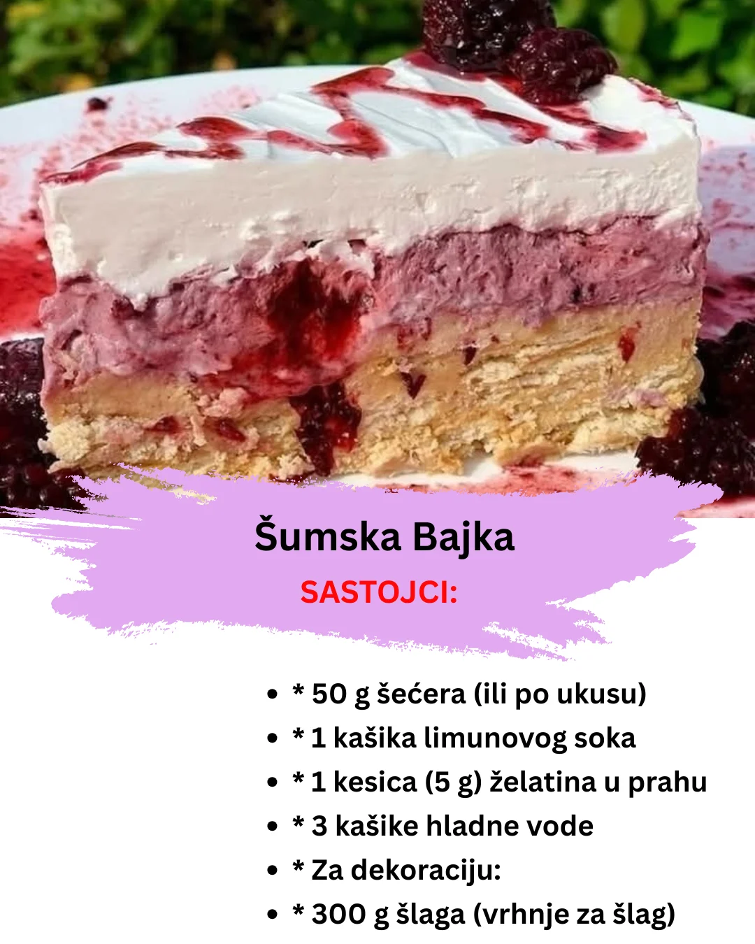* Dekorirajte: Prije posluživanja, umutite šlag dok ne dobijete čvrste vrhove. Premažite tortu umućenim šlagom. Ukrasite svježim kupinama ili drugim šumskim voćem po želji.