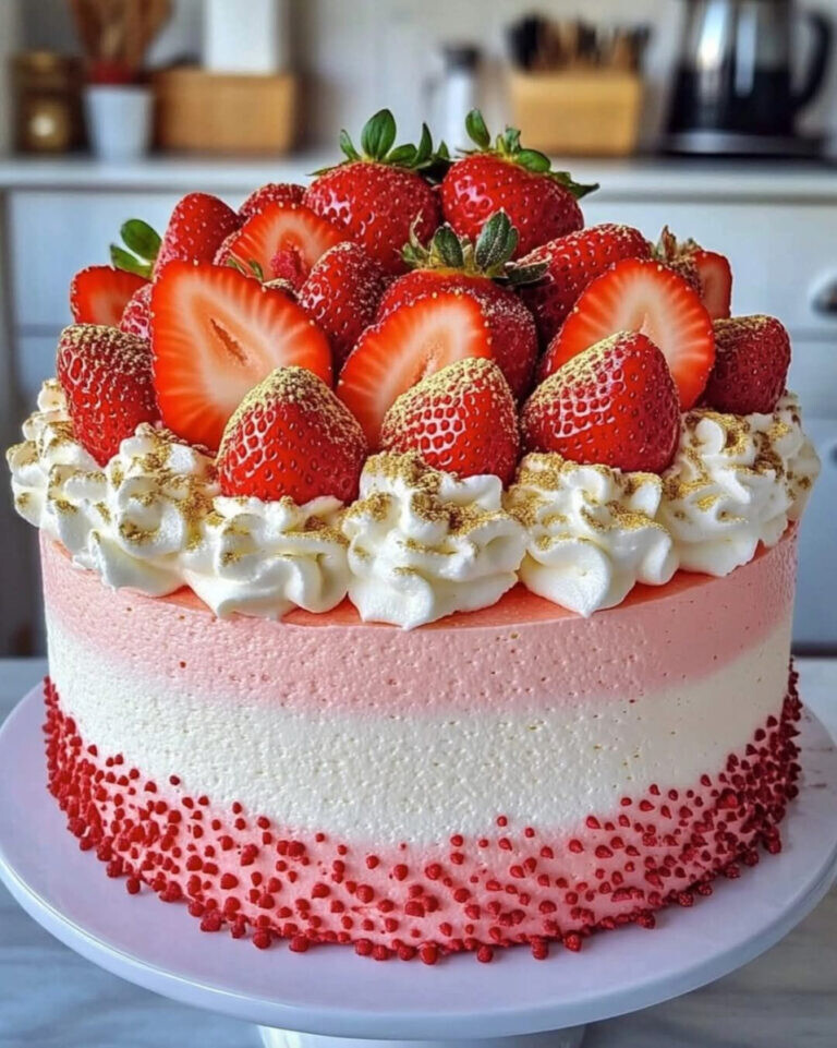 Dekorišite tortu sa svežim jagodama, pospite zlatnim šljokicama i prah šećerom po vrhu.