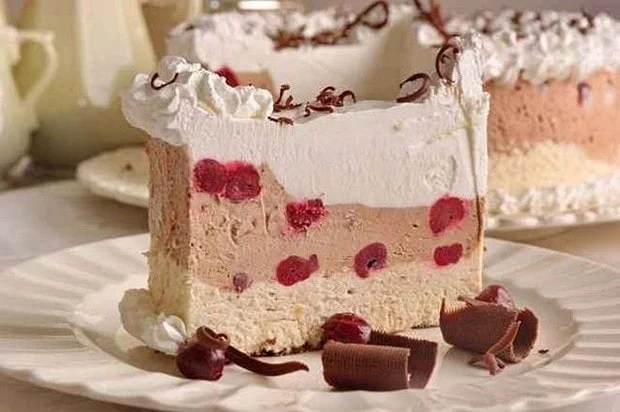 Staviti fil sa keksom, poredati polovinu ocijeđenih višanja, zatim čokoladni fil, preostale višnje i bijeli fil. Posuti preostalom čokoladom i ostaviti tortu u frižider da se dobro stegne. Prije služenja dekorisati tortu.
