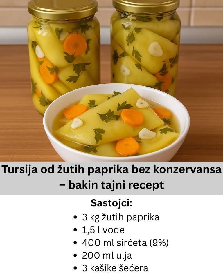 Ako tražiš recept za zimnicu koji je prirodan, zdrav i jednostavan za pripremu, onda je tursija od žutih paprika bez konzervansa pravi izbor. Ovaj bakin recept čuva se generacijama i garantuje savršeno hrskave i ukusne paprike koje mogu trajati i do godinu dana. Priprema je brza, sastojci su lako dostupni, a rezultat je neodoljiva zimnica koja obogaćuje svaki obrok.
