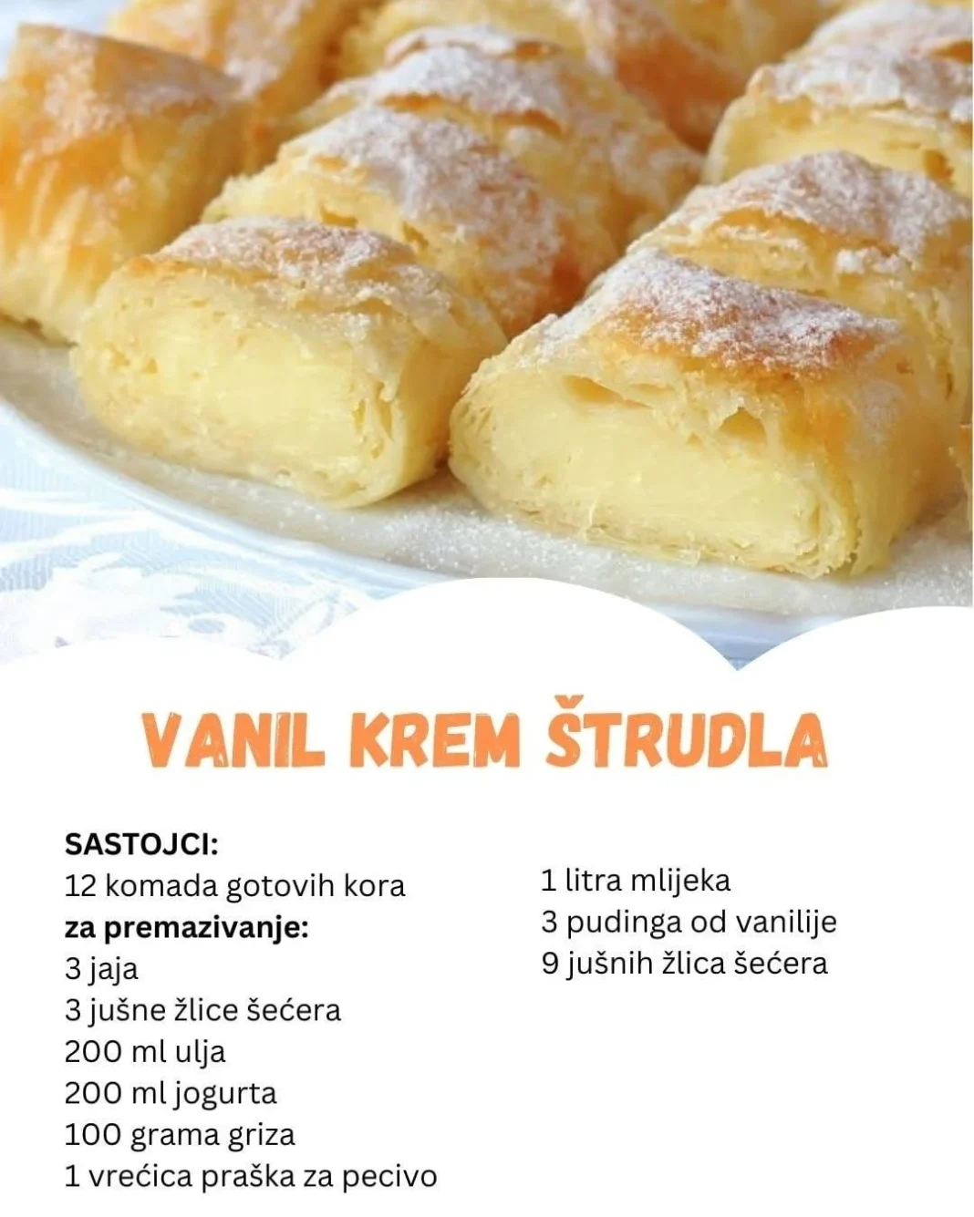 Poslužite ove predivne štrudle hladne, nakon što su se dobro ohladile u frižideru. Vanil krem štrudla je izuzetno osvežavajuća, a kombinacija kiselkastog jogurta, bogatog pudinga i mekanih kora čini ovu poslasticu nezaboravnom.