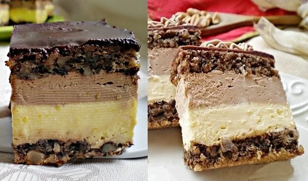 Na pladanj slagati biskvit (ja sam ga neznatno poškopila sa čoko mlijekom), pa žutu kremu, na nju rasporediti tamnu kremu pa poklopiti drugim djelom biskvita.