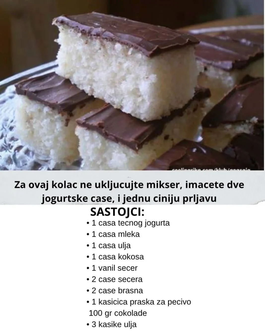 Za ovaj kolac ne ukljucujte mikser, imacete dve jogurtske case, i jednu ciniju prljavu, a ukupno vam treba par minuta da zbrckate ovu poslasticu.